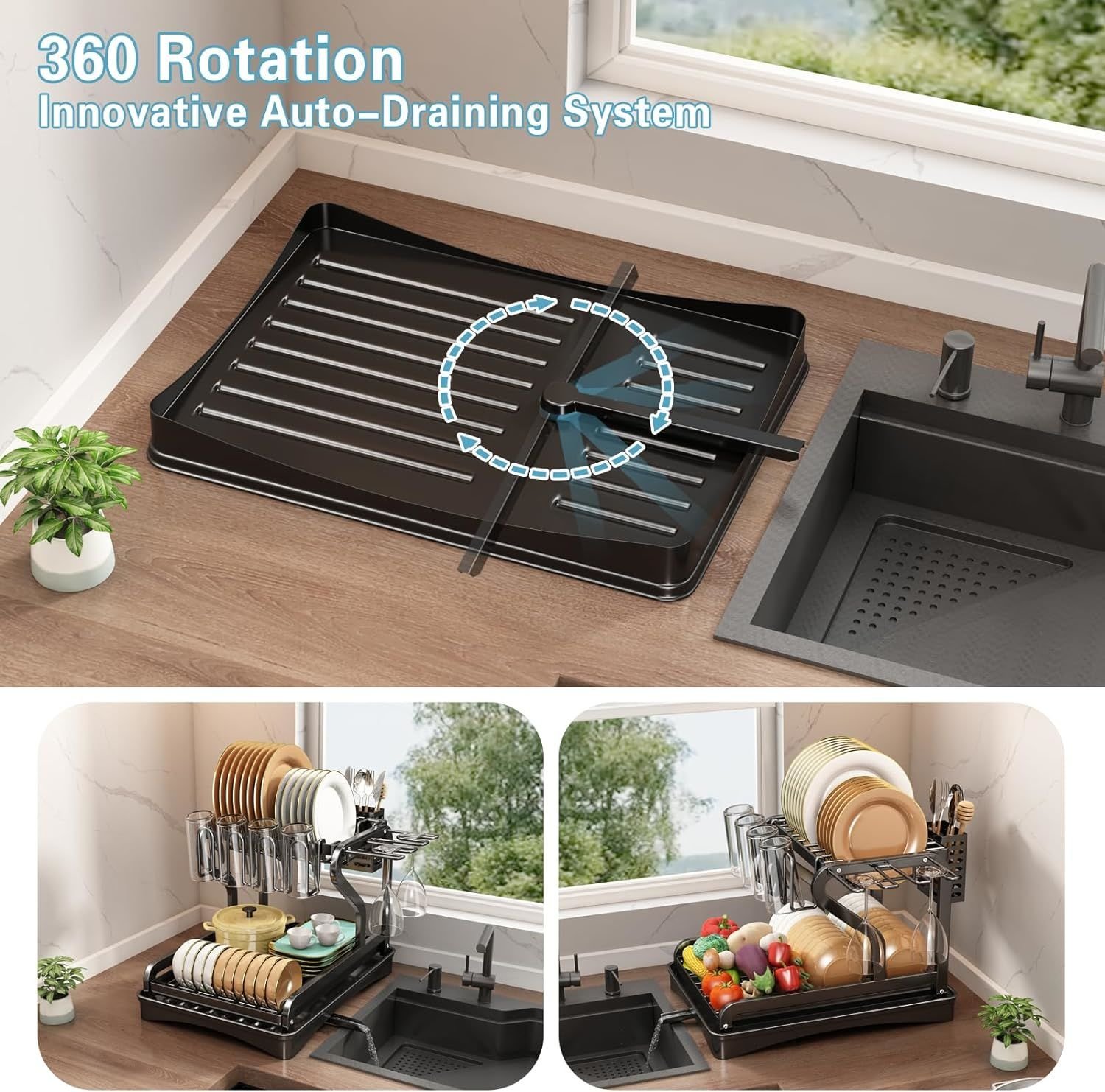 2.Space-Saving Design: Say goodbye to countertop clutter! Our two-tier dish rack boasts a compact and well-organized structure, maximizing your kitchen space. Finally, enjoy a clean and tidy kitchen without compromising on functionality.