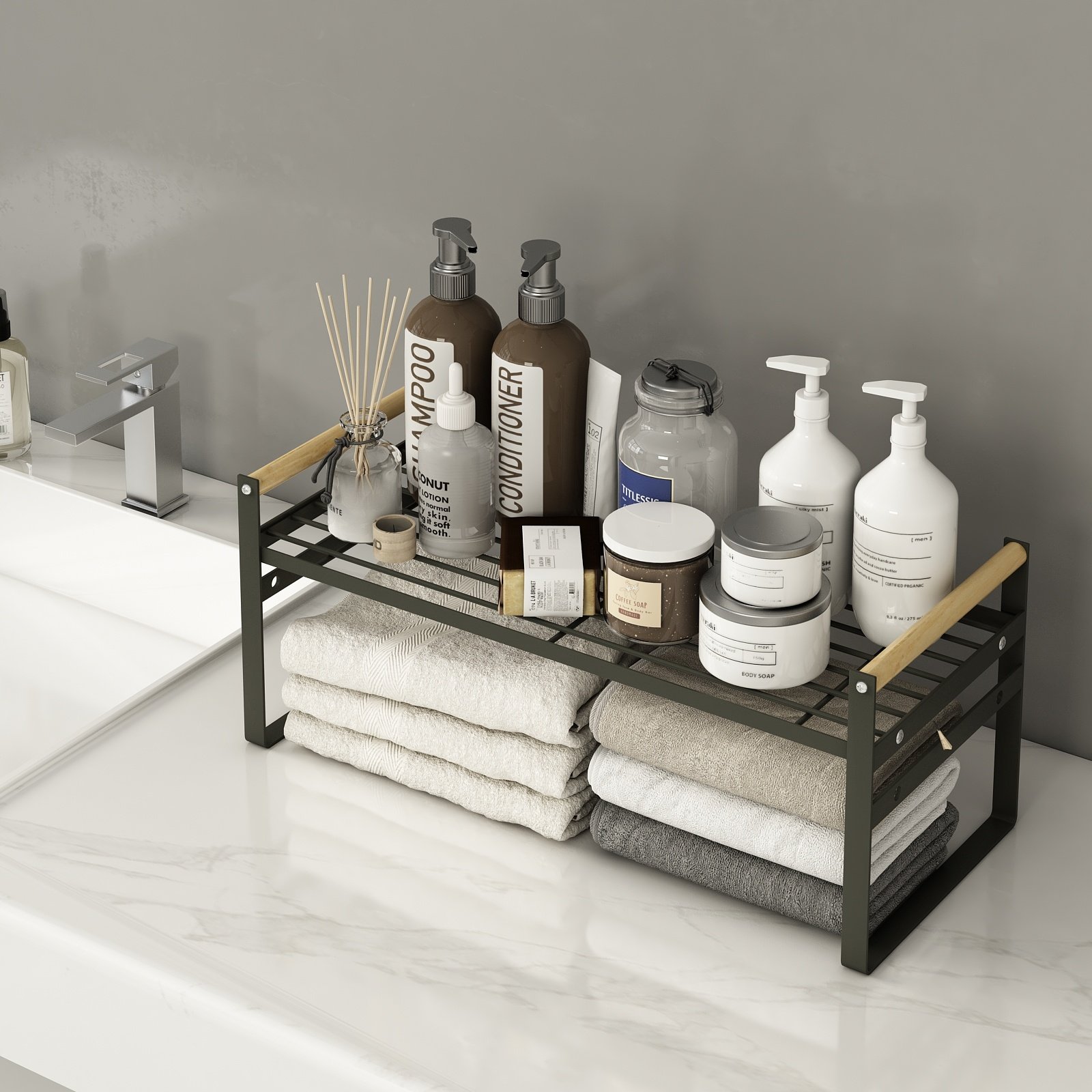 [Perfect for saving space and decoration] ➖ Very suitable for kitchen countertops, cabinets, food storage rooms, cabinets, shelves, under sinks, etc. This shelf is also suitable for living rooms, bedrooms, wardrobes, garages, showers, dressing tables, bookshelves, offices, closets, desks, tables, etc